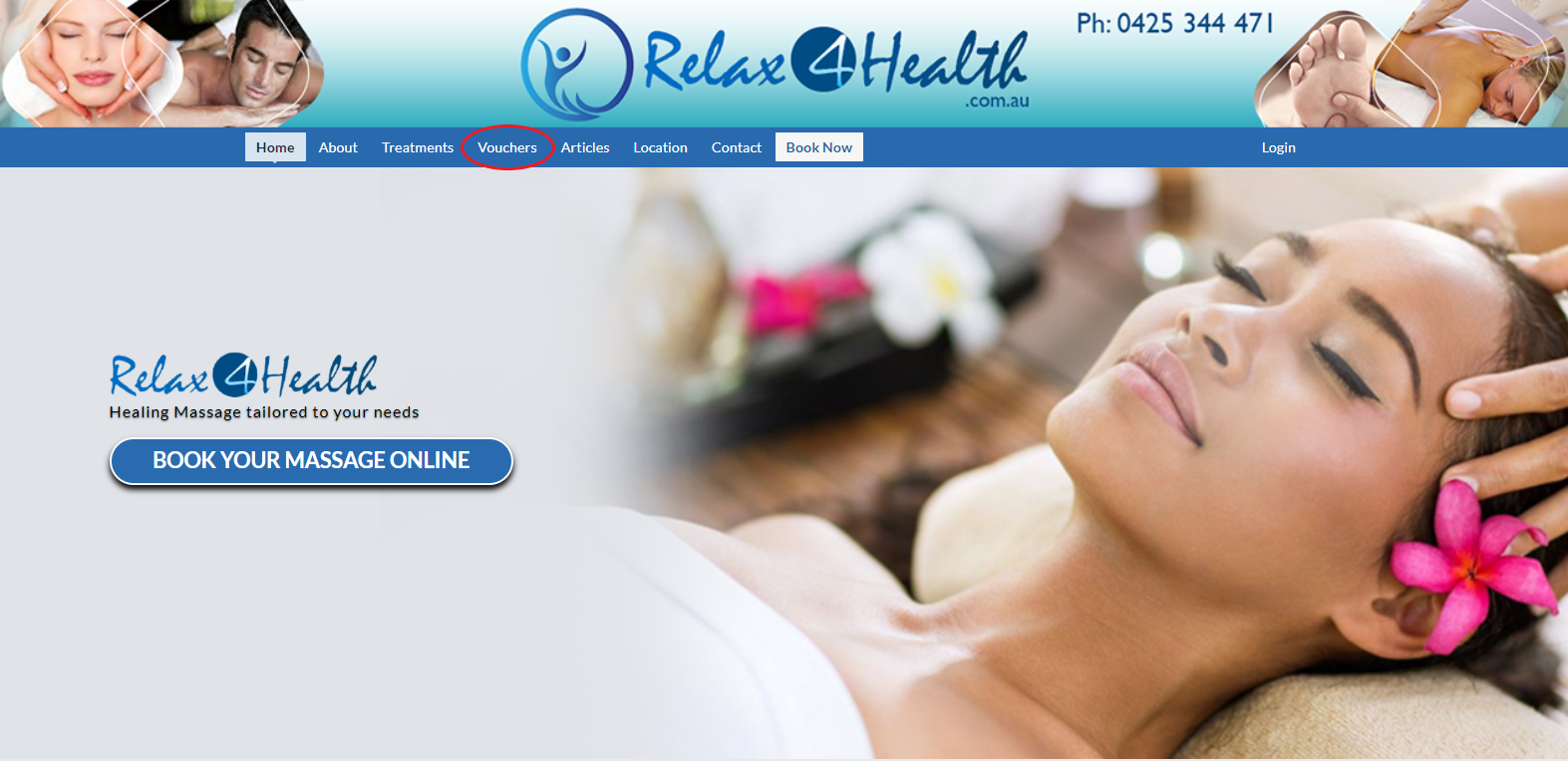 To buy a voucher from Relax4health.com.au on your computer. First click on the tab that says "Vouchers" just under the top banner.