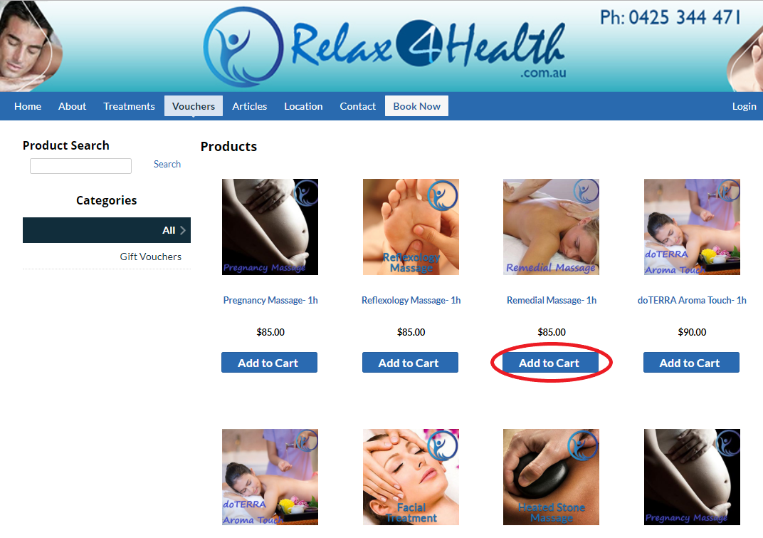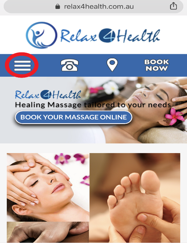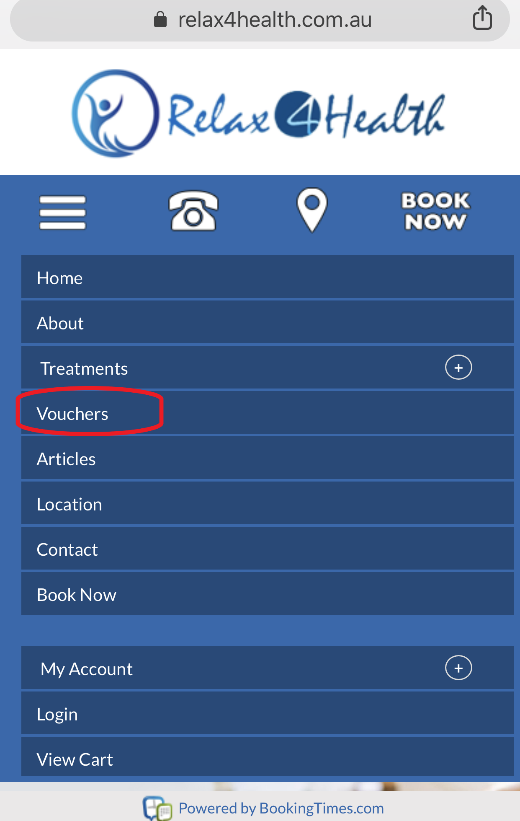 To buy a voucher from relax4health.com.au on your phone, first click on the three stacked lines to access the menu in the top left just under the top banner.